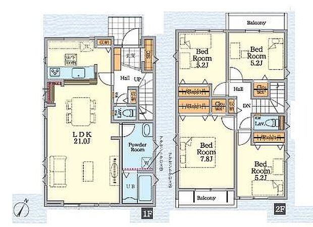 | 間取り | 4LDK 間取り内訳:リビングダイニングキッチン 21帖(1階)・洋室 7.8帖(2階)・洋室 5.2帖(2階)・洋室 5.2帖(2階)・洋室 5.2帖(2階) |