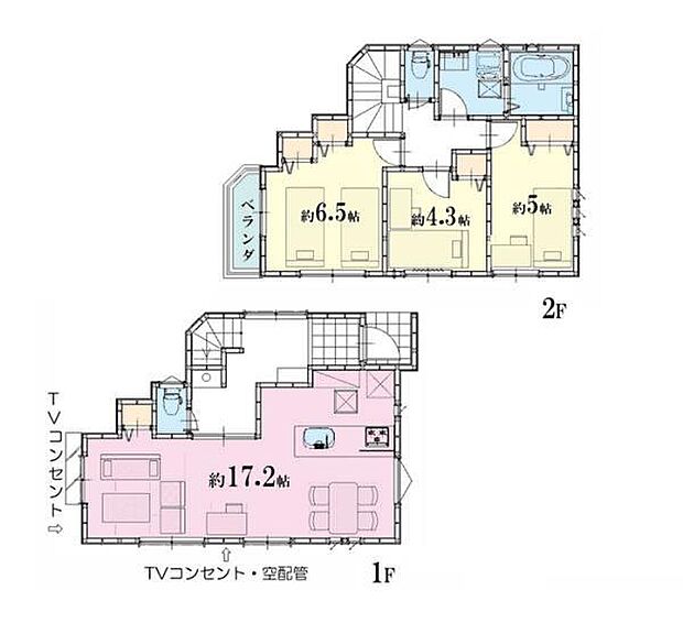 | 間取り | 3LDK 間取り内訳:リビングダイニングキッチン 17.2帖(1階)・洋室 6.5帖(2階)・洋室 4.3帖(2階)・洋室 5帖(2階) |