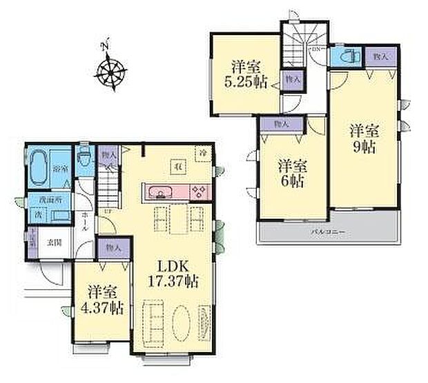| 間取り | 4LDK 間取り内訳:リビングダイニングキッチン 17.3帖(1階)・洋室 4.3帖(1階)・洋室 5.2帖(2階)・洋室 6帖(2階)・洋室 9帖(2階) |