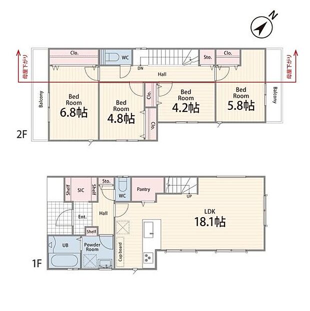 | 間取り | 4LDK 間取り内訳:リビングダイニングキッチン 18.1帖(1階)・洋室 6.8帖(2階)・洋室 4.8帖(2階)・洋室 4.2帖(2階)・洋室 5.8帖(2階) |
