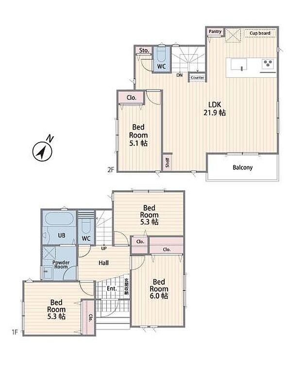 | 間取り | 4LDK 間取り内訳:洋室 5.3帖(1階)・洋室 6帖(1階)・洋室 5.3帖(1階)・洋室 5.1帖(2階)・リビングダイニングキッチン 21.9帖(2階) |
