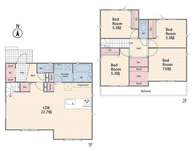 間取り内訳:リビングダイニングキッチン 22.7帖(1階)・洋室 5.3帖(2階)・洋室 5.3帖(2階)・洋室 7帖(2階)・洋室 5.3帖(2階)