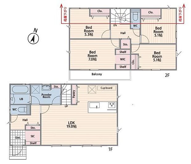 | 間取り | 4LDK 間取り内訳:リビングダイニングキッチン 19帖(1階)・洋室 5.3帖(2階)・洋室 7帖(2階)・洋室 5.1帖(2階)・洋室 5.1帖(2階) |