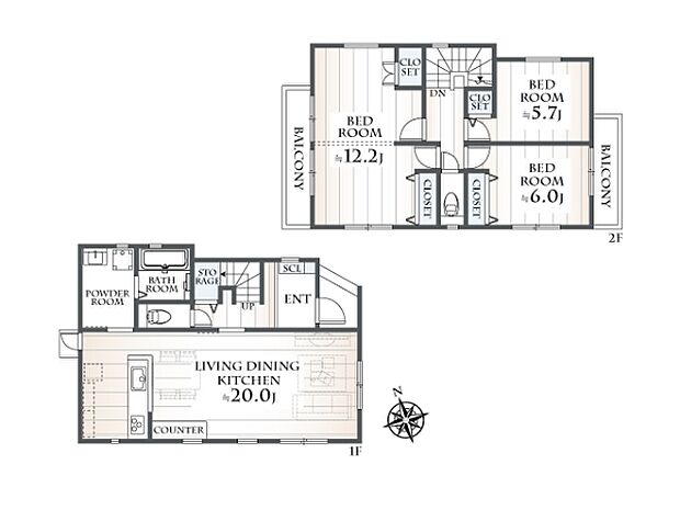 町田駅徒歩16分。敷地約45坪。並列2台駐車可。20帖の広々LDK。2ドア1ルームを採用した間取です
