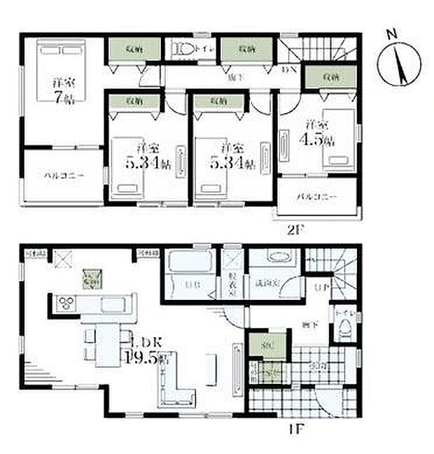 | 間取り | 4LDK 間取り内訳:リビングダイニングキッチン 19.5帖(1階)・洋室 7帖(2階)・洋室 5.3帖(2階)・洋室 5.3帖(2階)・洋室 4.5帖(2階) |
