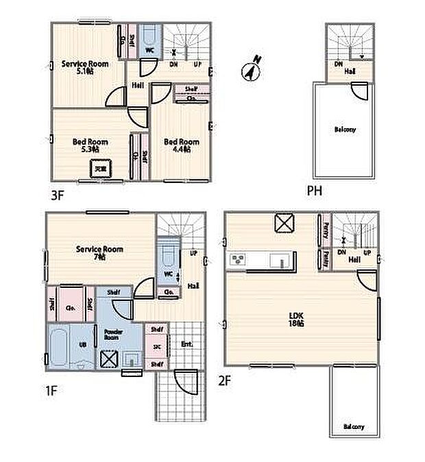 間取り内訳:収納 7帖(1階)・リビングダイニングキッチン 18帖(2階)・洋室 4.4帖(3階)・洋室 5.3帖(3階)・収納 5.1帖(3階)