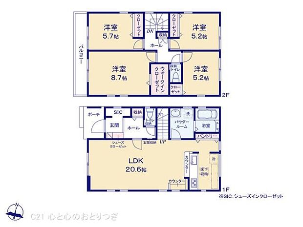 ゆとりの敷地約38坪。車2台並列駐車可能です。シューズインクローゼットやWICなど収納豊富。
