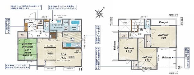 敷地面積は広々54坪!お車2台駐車可能です。開放感溢れる折上天井のリビングはゆとりの18帖!足元から