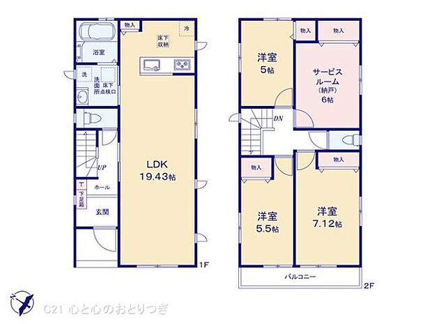 | 間取り | 3SLDK 間取り内訳:リビングダイニングキッチン 19.4帖(1階) |