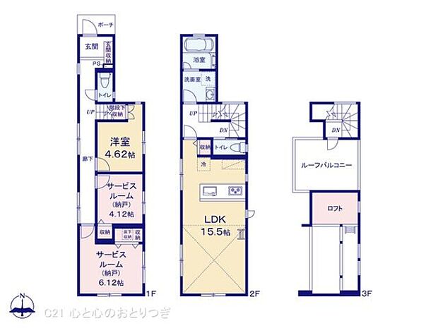 2階にLDKと洗面・バスルームのある間取りです。季節ものなどの収納に便利なロフト付き。