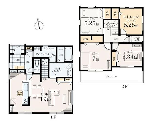 | 間取り | 3SLDK 間取り内訳:リビングダイニングキッチン 19帖(1階)・洋室 5.2帖(2階)・洋室 7帖(2階)・洋室 5.3帖(2階)・収納 5.2帖(2階) |