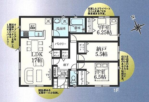 | 間取り | 2SLDK 間取り内訳:リビングダイニングキッチン 17帖(1階)・洋室 6.5帖(1階)・収納 5.5帖(1階)・洋室 6.2帖(1階) |