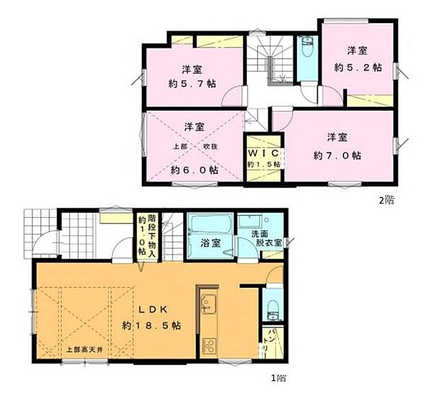 | 間取り | 4LDK 間取り内訳:リビングダイニングキッチン 18.5帖(1階)・洋室 5.7帖(2階)・洋室 6帖(2階)・洋室 7帖(2階)・洋室 5.2帖(2階) |