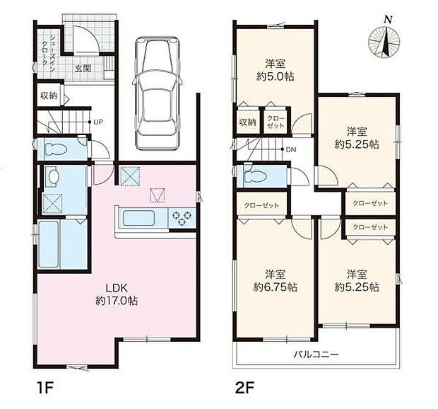 | 間取り | 4LDK 間取り内訳:リビングダイニングキッチン 17帖(1階)・洋室 6.7帖(2階)・洋室 5.2帖(2階)・洋室 5.2帖(2階)・洋室 5帖(2階) |
