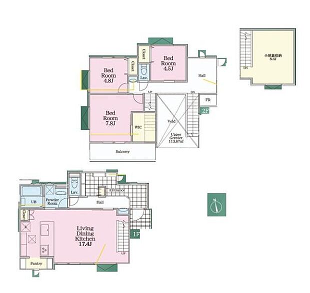 | 間取り | 3LDK 間取り内訳:リビングダイニングキッチン 17.4帖(1階)・洋室 4.5帖(2階)・洋室 4.8帖(2階)・洋室 7.8帖(2階) |