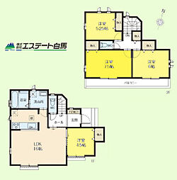 | 間取り | 3LDK 間取り内訳:リビングダイニングキッチン 18.5帖(1階)・洋室 6.1帖(2階)・洋室 6.2帖(2階)・洋室 7.1帖(2階) |