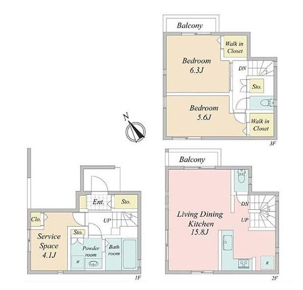 | 間取り | 2SLDK 間取り内訳:収納 4.1帖(1階)・リビングダイニングキッチン 15.8帖(2階)・洋室 6.3帖(3階)・洋室 5.6帖(3階) |