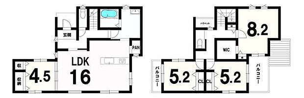 | 間取り | 4LDK 間取り内訳:リビングダイニングキッチン 16帖・洋室 8.2帖・洋室 5.2帖・洋室 5.2帖・洋室 4.5帖 |