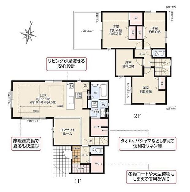 | 間取り | 4LDK 間取り内訳:リビングダイニングキッチン 22.9帖(1階)・洋室 8.4帖(2階)・洋室 4帖(2階)・洋室 5.6帖(2階)・洋室 5帖(2階) |