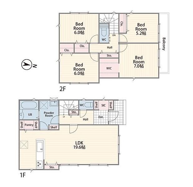 | 間取り | 4LDK 間取り内訳:リビングダイニングキッチン 19.6帖(1階)・洋室 6帖(2階)・洋室 6帖(2階)・洋室 7帖(2階)・洋室 5.2帖(2階) |