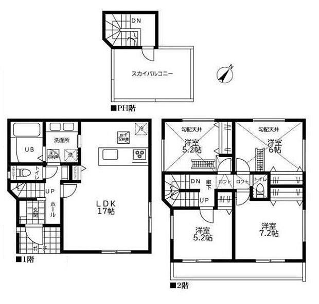 | 間取り | 4LDK 間取り内訳:リビングダイニングキッチン 17帖(1階)・洋室 5.2帖(2階)・洋室 6帖(2階)・洋室 7.2帖(2階)・洋室 5.2帖(2階) |