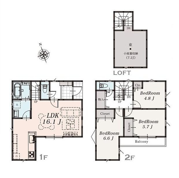 | 間取り | 3LDK 間取り内訳:リビングダイニングキッチン 16.1帖(1階)・洋室 6.6帖(2階)・洋室 5.7帖(2階)・洋室 4.8帖(2階) |