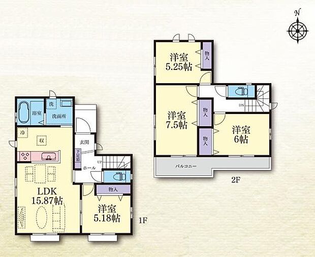 | 間取り | 4LDK 間取り内訳:リビングダイニングキッチン 15.8帖(1階)・洋室 5.1帖(1階)・洋室 5.2帖(2階)・洋室 7.5帖(2階)・洋室 6帖(2階) |