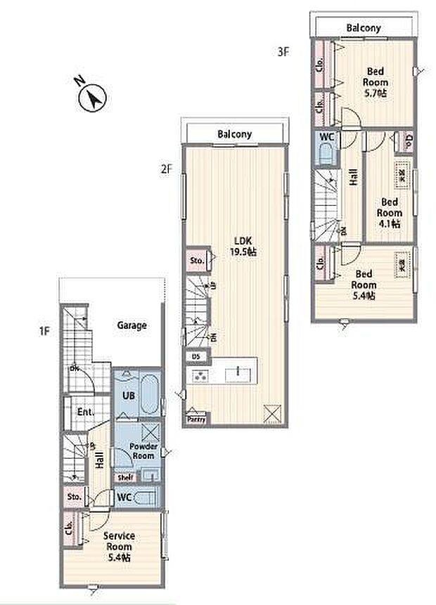 | 間取り | 3SLDK 間取り内訳:収納 5.4帖(1階)・リビングダイニングキッチン 19.5帖(2階)・洋室 5.7帖(3階)・洋室 4.1帖(3階)・洋室 5.4帖(3階) |