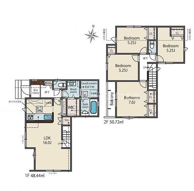 | 間取り | 4LDK 間取り内訳:洋室 7帖(2階)・洋室 5.2帖(2階)・洋室 5.2帖(2階)・洋室 5.2帖(2階)・リビングダイニングキッチン 16帖(1階) |