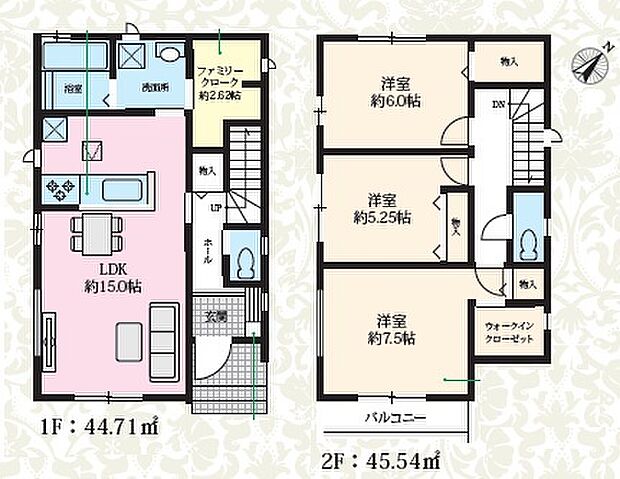 | 間取り | 3SLDK(3SLDK+WIC) 間取り内訳:リビングダイニングキッチン 15帖(1階)・洋室 6帖(2階)・洋室 5.2帖(2階)・洋室 7.5帖(2階) |