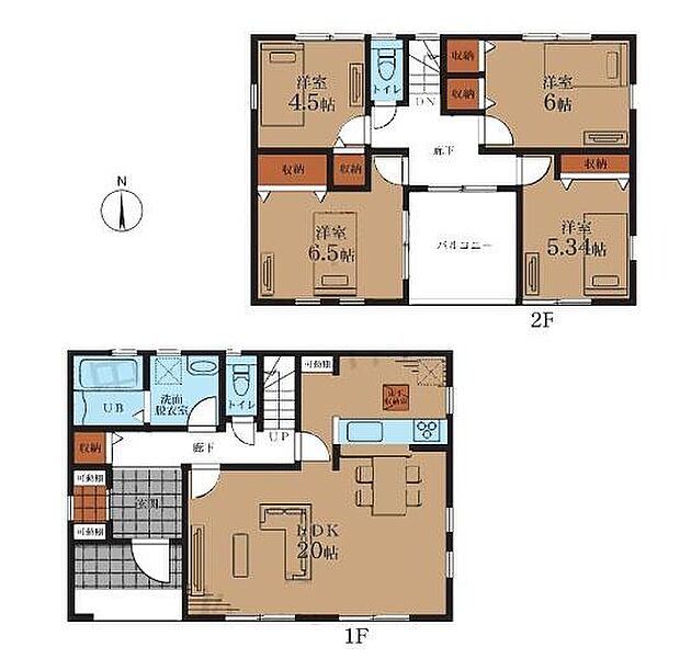 | 間取り | 4LDK 間取り内訳:リビングダイニングキッチン 20帖(1階)・洋室 4.5帖(2階)・洋室 6.5帖(2階)・洋室 5.3帖(2階)・洋室 6帖(2階) |