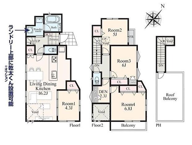 | 間取り | 4LDK 間取り内訳:リビングダイニングキッチン 16.2帖(1階)・洋室 4.3帖(1階)・洋室 5帖(2階)・洋室 6帖(2階)・洋室 6.8帖(2階) |