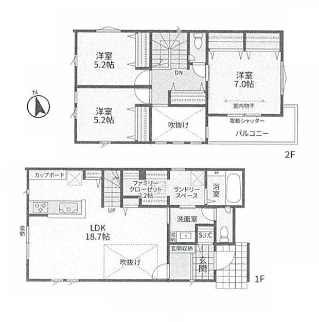 | 間取り | 3LDK 間取り内訳:リビングダイニングキッチン 18.7帖(1階)・洋室 5.2帖(2階)・洋室 5.2帖(2階)・洋室 7帖(2階) |