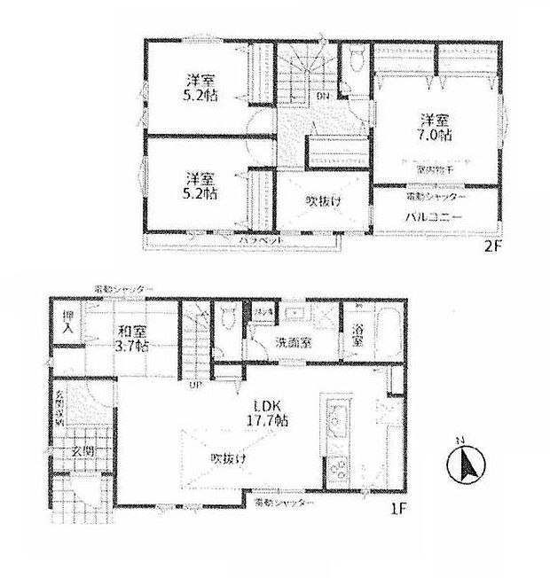 | 間取り | 3LDK 間取り内訳:リビングダイニングキッチン 17.7帖(1階)・洋室 5.2帖(2階)・洋室 5.2帖(2階)・洋室 7帖(2階) |