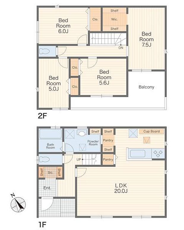 | 間取り | 4LDK 間取り内訳:リビングダイニングキッチン 20帖(1階)・洋室 6帖(2階)・洋室 5帖(2階)・洋室 5.6帖(2階)・洋室 7.5帖(2階) |