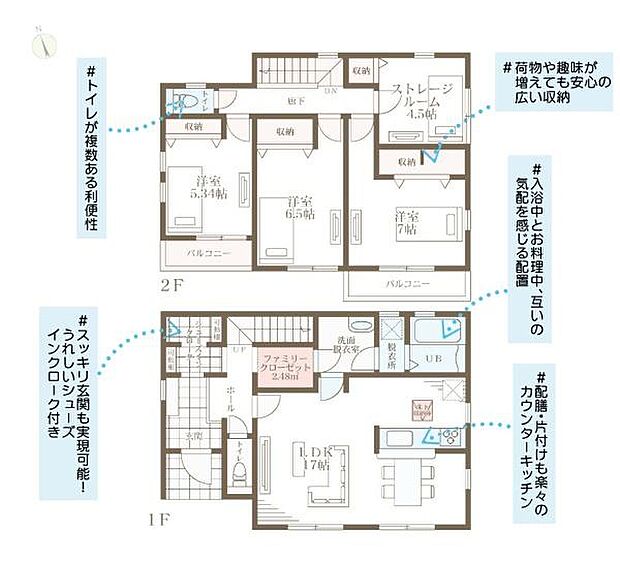 | 間取り | 3SLDK 間取り内訳:リビングダイニングキッチン 17帖(1階)・洋室 5.3帖(2階)・洋室 6.5帖(2階)・洋室 7帖(2階)・収納 4.5帖(2階) |