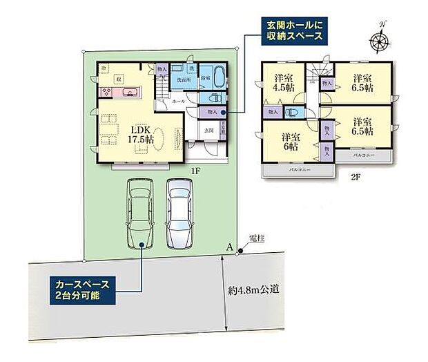 | 間取り | 4LDK 間取り内訳:リビングダイニングキッチン 17.5帖(1階)・洋室 4.5帖(2階)・洋室 6帖(2階)・洋室 6.5帖(2階)・洋室 6.5帖(2階) |