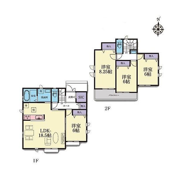 | 間取り | 4LDK 間取り内訳:リビングダイニングキッチン 18.5帖(1階)・洋室 6帖(1階)・洋室 8.2帖(2階)・和室 6畳(2階)・洋室 6帖(2階) |