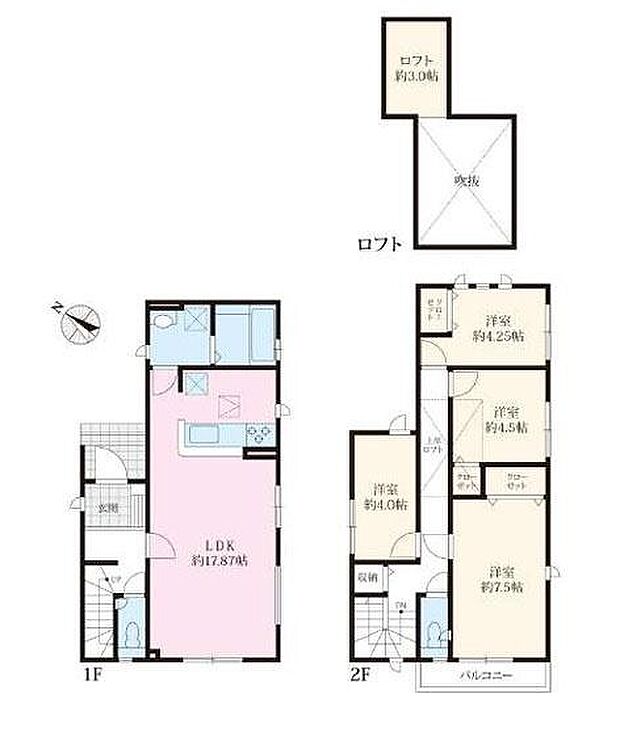 間取り内訳:リビングダイニングキッチン 17.8帖(1階)・洋室 4帖(2階)・洋室 7.5帖(2階)・洋室 4.5帖(2階)・洋室 4.2帖(2階)