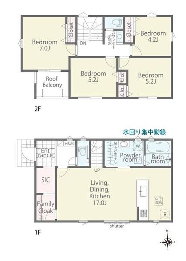 | 間取り | 4LDK 間取り内訳:リビングダイニングキッチン 17帖(1階)・洋室 7帖(2階)・洋室 5.2帖(2階)・洋室 5.2帖(2階)・洋室 4.2帖(2階) |