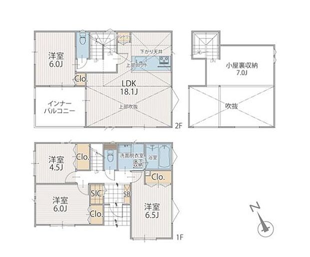 | 間取り | 4LDK 間取り内訳:洋室 4.5帖(1階)・洋室 6帖(1階)・洋室 6.5帖(1階)・リビングダイニングキッチン 18.1帖(2階)・洋室 6帖(2階) |