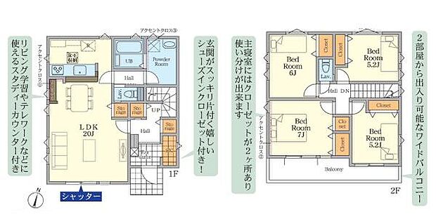 | 間取り | 4LDK 間取り内訳:リビングダイニングキッチン 20帖(1階)・洋室 6帖(2階)・洋室 7帖(2階)・洋室 5.2帖(2階)・洋室 5.2帖(2階) |