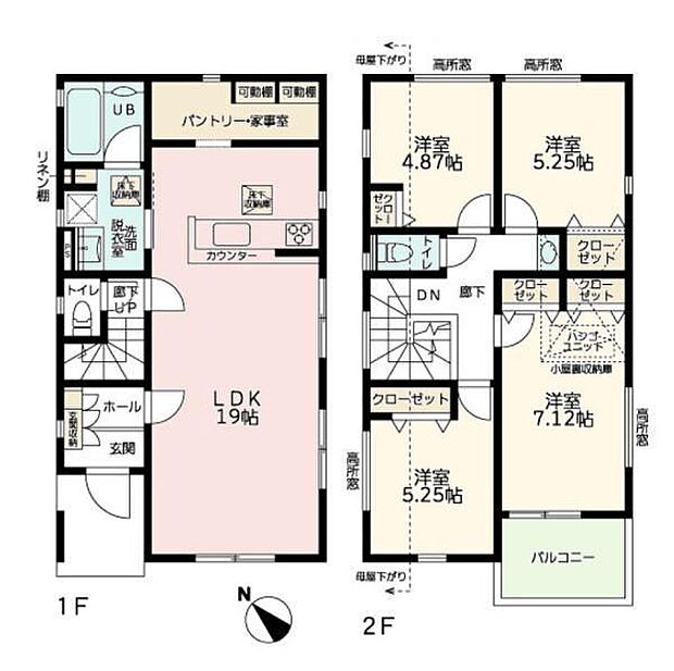 | 間取り | 4LDK 間取り内訳:洋室 5.2帖(2階)・洋室 4.8帖(2階)・リビングダイニングキッチン 19帖(1階)・洋室 5.2帖(2階)・洋室 7.1帖(2階) |