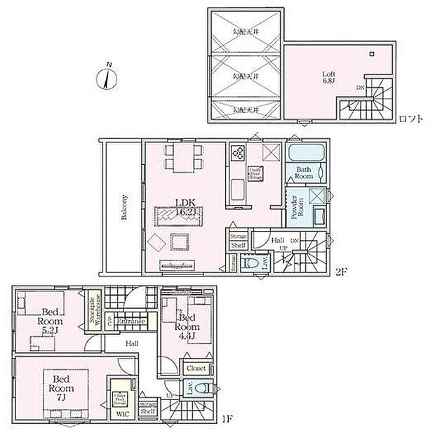 | 間取り | 3LDK 間取り内訳:洋室 5.2帖(1階)・洋室 7帖(1階)・洋室 4.4帖(1階)・リビングダイニングキッチン 16.2帖(2階) |