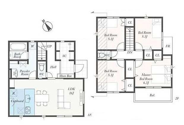 | 間取り | 4LDK 間取り内訳:リビングダイニングキッチン 16帖(1階)・洋室 5.3帖(2階)・洋室 5.3帖(2階)・洋室 6.3帖(2階)・洋室 5.3帖(2階) |