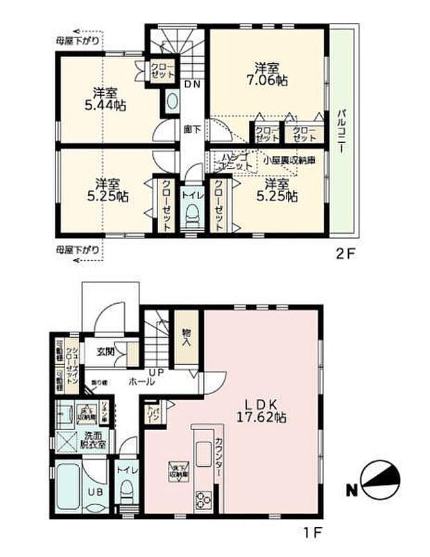 | 間取り | 4LDK 間取り内訳:洋室 7帖(2階)・リビングダイニングキッチン 17.6帖(1階)・洋室 5.4帖(2階)・洋室 5.2帖(2階)・洋室 5.2帖(2階) |