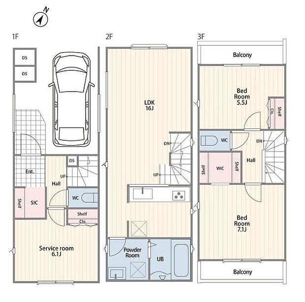| 間取り | 2SLDK 間取り内訳:収納 6.1帖(1階)・リビングダイニングキッチン 16帖(2階)・洋室 5.5帖(3階)・洋室 7.1帖(3階) |