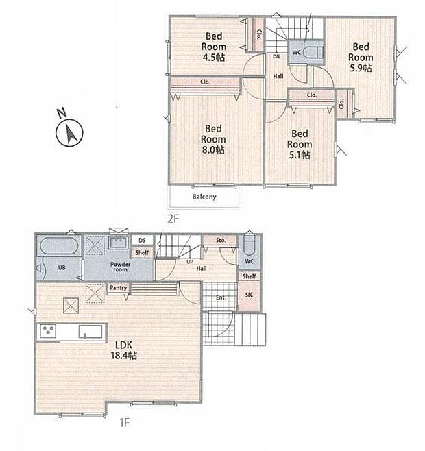 | 間取り | 4LDK 間取り内訳:リビングダイニングキッチン 18.4帖(1階)・洋室 4.5帖(2階)・洋室 8帖(2階)・洋室 5.1帖(2階)・洋室 5.9帖(2階) |