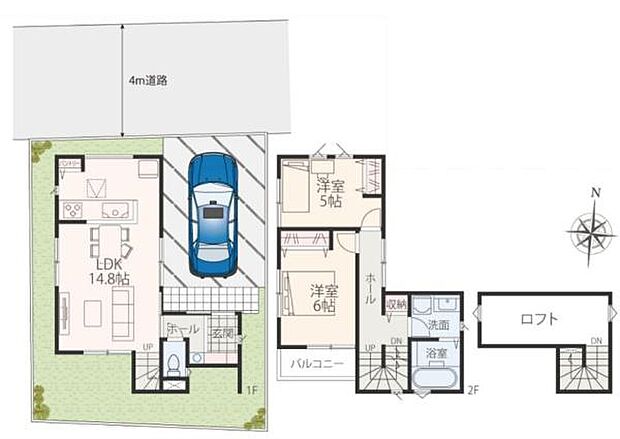 | 間取り | 2LDK 間取り内訳:リビングダイニングキッチン 14.8帖(1階)・洋室 6帖(2階)・洋室 5帖(2階) |