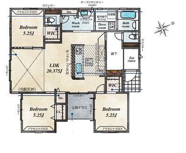 | 間取り | 3LDK 間取り内訳:リビングダイニングキッチン 20.3帖(1階)・洋室 5.2帖(1階)・洋室 5.2帖(1階)・洋室 5.2帖(1階) |